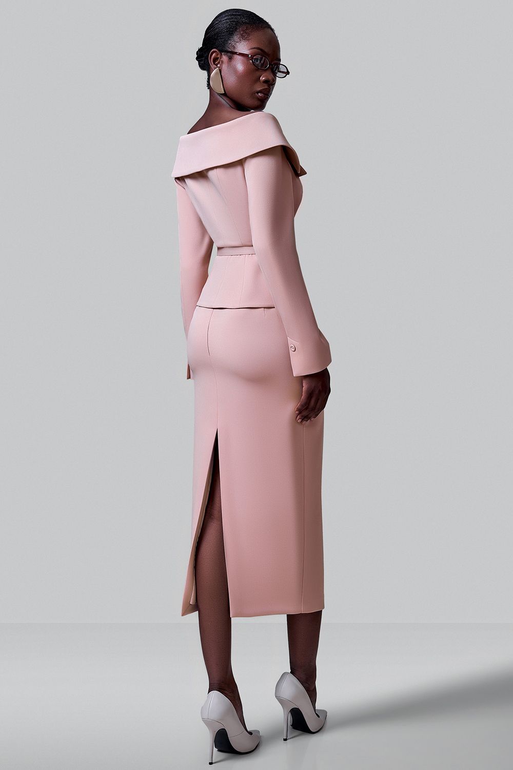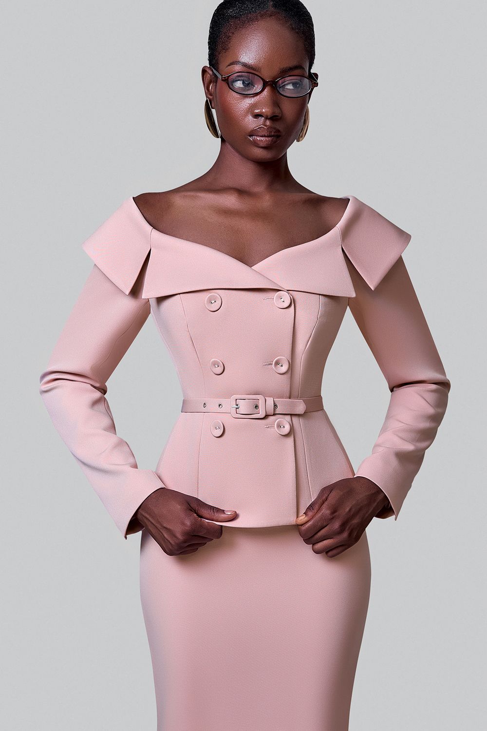 Приталенный жакет с поясом и открытой линией плеч