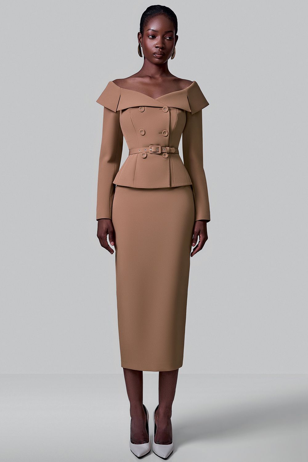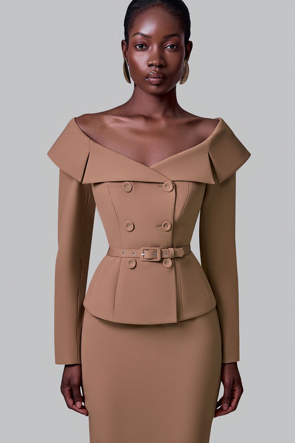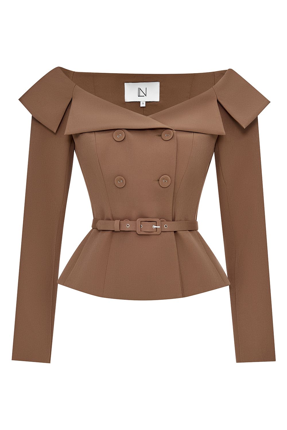 Жакет выполнен из плотной костюмной ткани. Модель отличается элегантным дизайном с открытыми плечами и широким отложным воротником, который придаёт образу утончённость. Двубортная застёжка декорирована крупными пуговицами в тон изделия. Талия подчеркнута съемным ремнём с пряжкой, создающим изящный силуэт «песочные часы». Длинные рукава и аккуратная посадка по фигуре делают жакет универсальным вариантом для вечерних выходов. Состав: 60% полиэстер, 35% вискоза, 5% эластан, Подкладка 95% полиэстер, 5% эластан