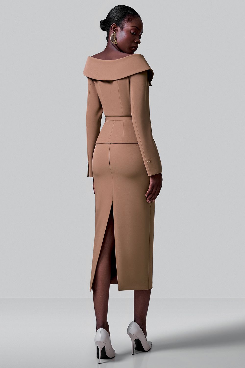 Приталенный жакет с поясом и открытой линией плеч