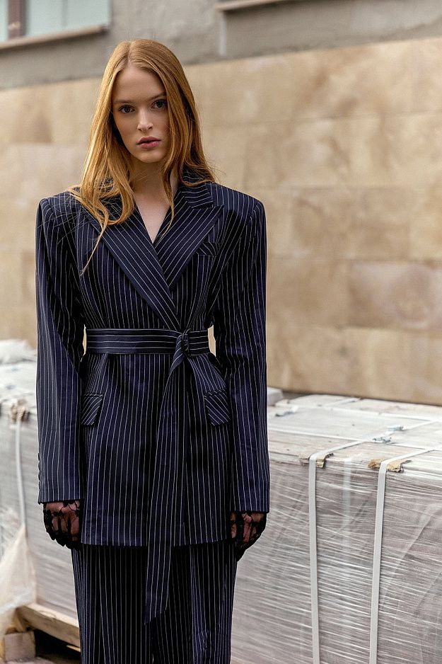 Элегантный двубортный жакет прямого кроя с акцентной линией плеч и поясом на металлической пряжке. Выполнен из костюмной ткани с тонкой вертикальной полоской, визуально вытягивающей силуэт. Лацканы классической формы, накладные карманы с клапанами и нагрудный карман добавляют образу строгости и стиля. Состав: 65% полиэстер, 30% вискоза, 5% спандекс ; подкладка: 95% полиэстер, 5% эластан