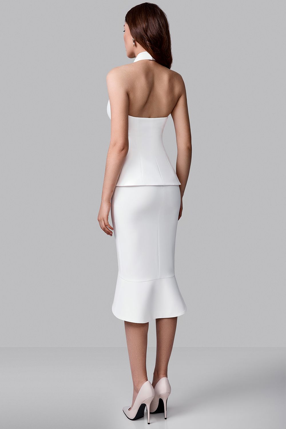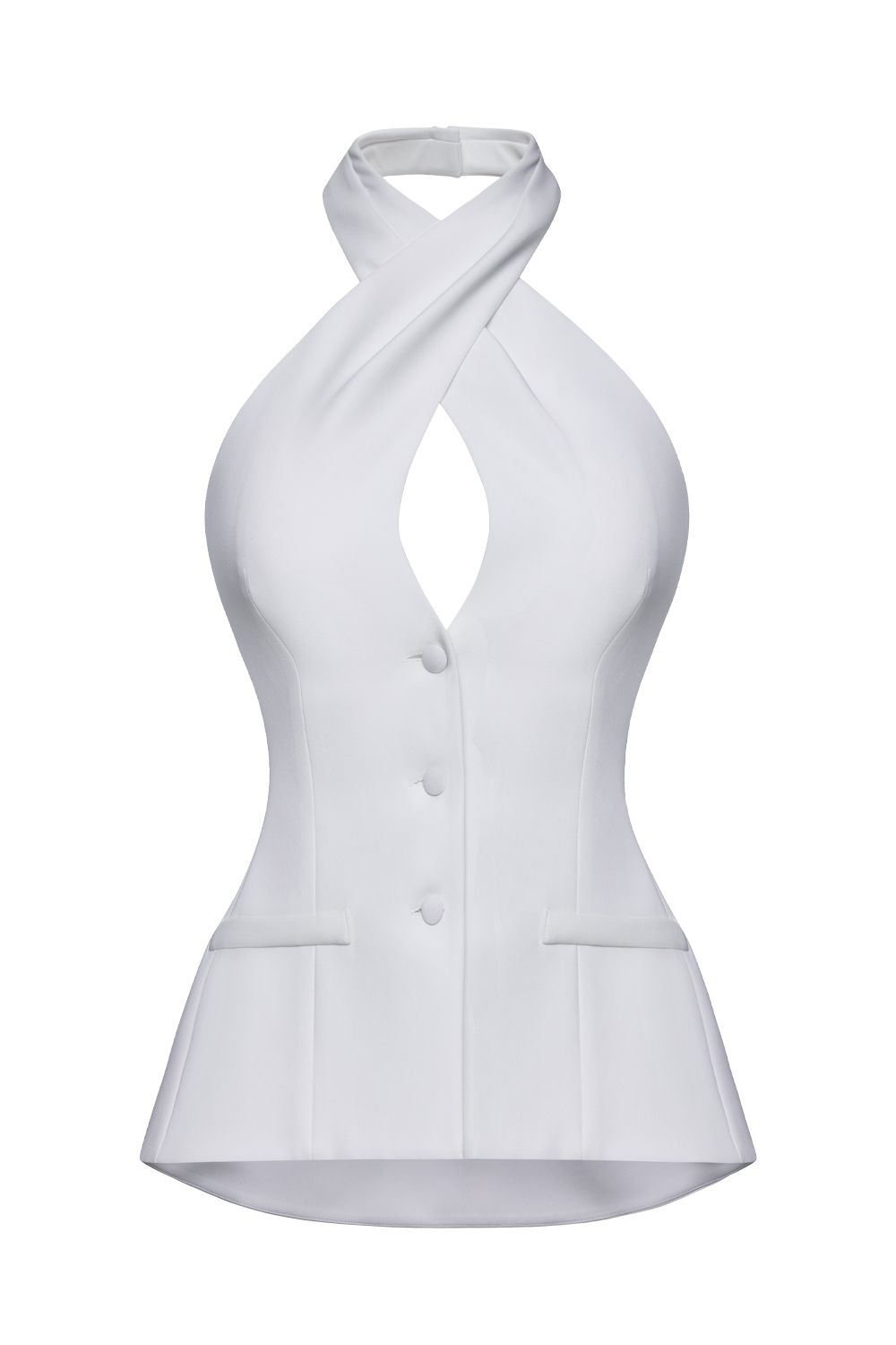 Эта модель переосмысливает классический жилет, превращая его в выразительный топ с архитектурным силуэтом. Перекрёстный халтер-воротник открывает линию плеч, а фигурный вырез добавляет тонкий акцент женственности. Приталенный крой подчёркивает фигуру, создавая чистый и вытянутый силуэт. Застёжка на пуговицы и аккуратные карманы отсылают к классическому тейлорингу. Идеально сочетается как с юбками, так и с брюками, формируя современный вечерний или дневной образ.Состав:71% полиэстер, 23% вискоза, 6% эластан, Подклад 95% полиэстер 5% эластан